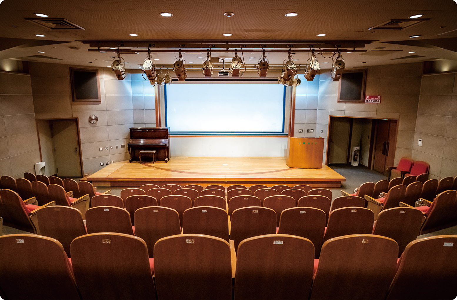 森のホール Forest Hall 映像、音響、照明設備を備えた144席のホールです。 企業研修や講習会、音楽活動などでご利用いただけます。