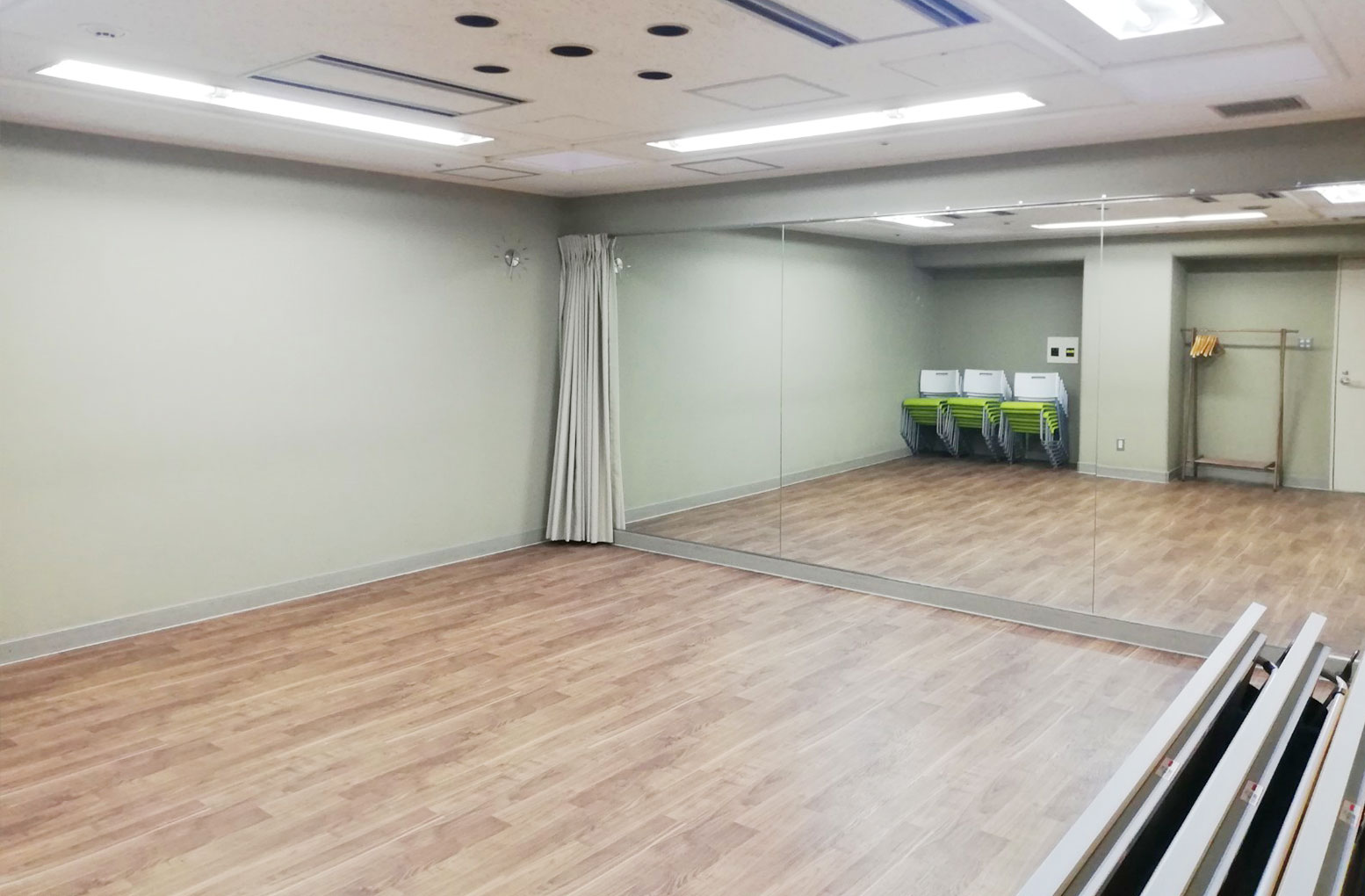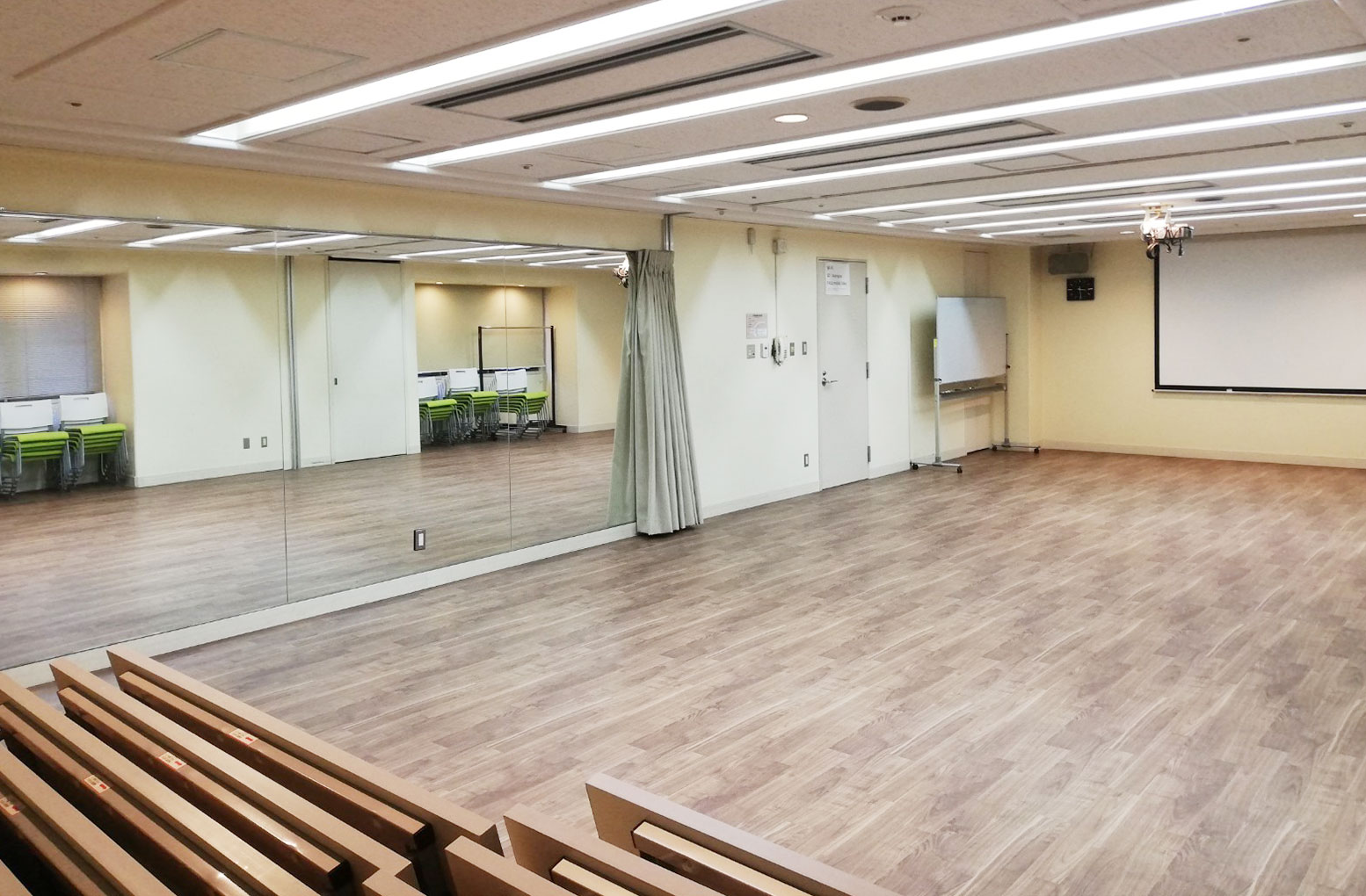 | ミーティングルーム1 | スクール形式:60名 | 9:00~21:00 | ホワイトボード、備え付けプロジェクター、備え付けスクリーン、備え付け鏡(約610cm × 約190cm)、移動式鏡(約190cm × 約120cm 計2つ) |